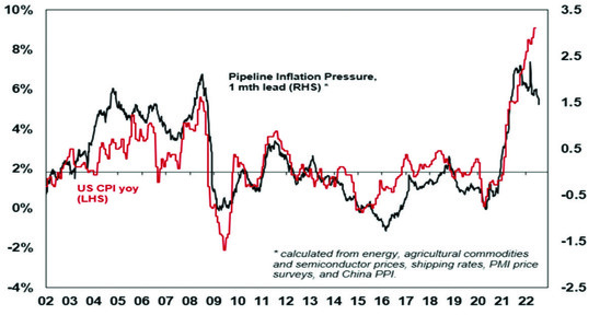 #1 Global supply bottlenecks are easing and this will take pressure off inflation. This is evident in various global business surveys showing reduced delivery times, falling work backlogs, lower freight costs, lower metal and grain prices, and falling input and output prices. As a result, our Pipeline Inflation Indicator for the US is trending down. Core inflation in the US is showing signs of having peaked and Australia appears to be following the US by about six months, pointing to a peak in inflation here later this year. A return to more normal weather after the floods should also help lower local food prices.