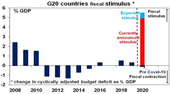 Second, we have seen massive upfront monetary and fiscal easing which has propped up businesses, jobs, incomes and the flow of credit relative to what otherwise would have occurred. Interest rates have gone to record lows, quantitative easing has become the norm and most importantly fiscal stimulus as a share of GDP in developed countries has been at a record levels. This is in stark contrast to most post war recessions that have seen policy response come with a lag as it’s taken longer to realise the economy needs help. And in the Great Depression, monetary and fiscal policy was first tightened.