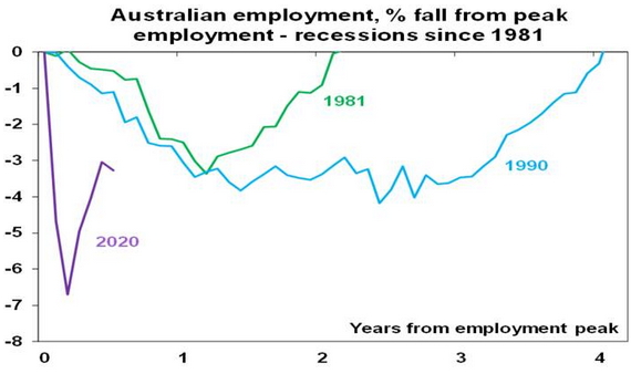 A sharp hit followed by an initial “deep V” rebound can also be seen in Australian employment, which has now recovered about half the job losses seen in April and May.