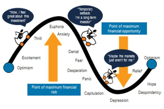 This is perhaps one of the best characterisations of how an investment cycle unfolds. It follows that the point of maximum opportunity is around the time most are pessimistic and bearish (as this is often when the market is cheapest) and the point of maximum risk is when all are euphoric (this is often when the market is most expensive), but unfortunately many don’t realise this because it involves going against the crowd. So, in trying to assess whether we are at the bottom or the peak of a cycle it’s worth considering whether we are seeing pessimism and depression for bottoms and euphoria for tops.