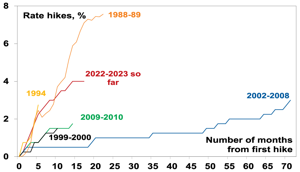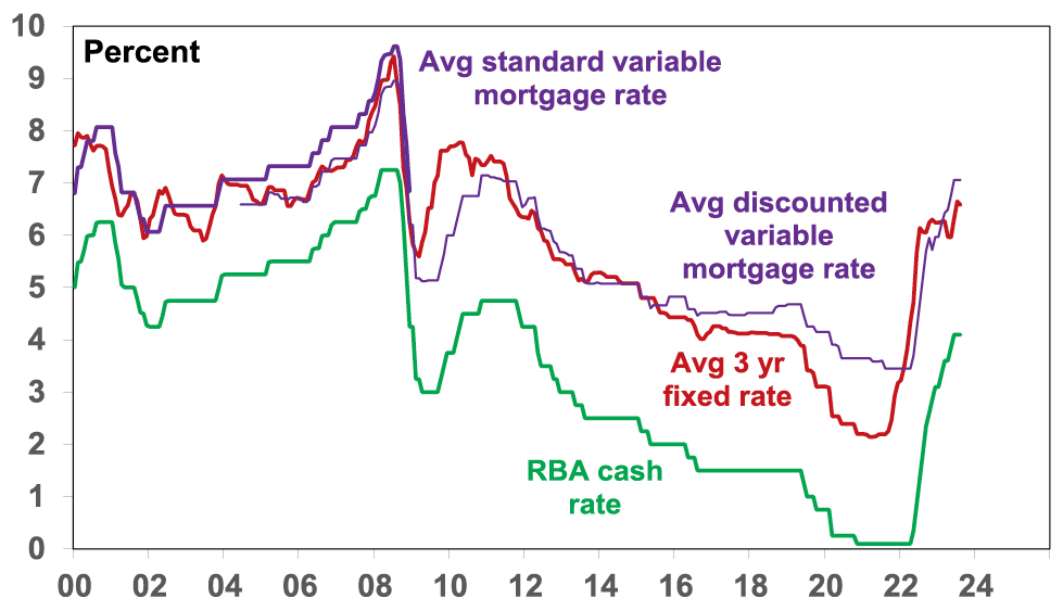First, rate hikes impact the economy with a lag of a year or more. This is because it takes a while for the hikes to be passed through to borrowers and for them to adjust their spending and for this to impact companies and jobs. This time around the lag has likely been lengthened by savings buffers built up in the pandemic, the reopening boost, more than normal home borrowers locking in at 2% or so fixed mortgage rates in the pandemic and the highly competitive mortgage market which has meant that actual mortgage rates paid on outstanding mortgages have gone up by less than the cash rate. However, these protections are now wearing off.