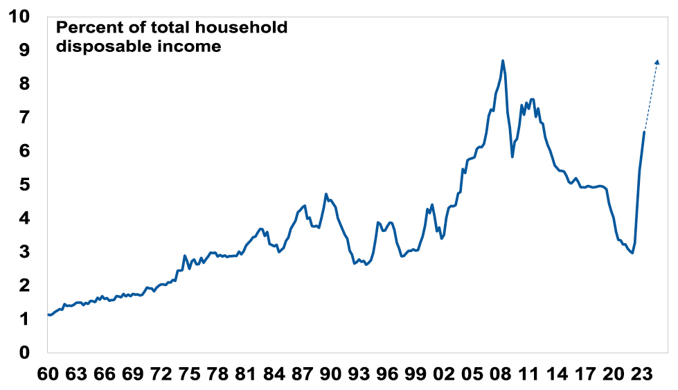 The rate hikes since April last year mean that a variable rate borrower with a $600,000 mortgage will have seen around $1300 a month added to their mortgage payments. That’s an extra $15,700 a year. Even if the borrower has managed to get a 0.5% discount to their mortgage rate it would amount to an extra $13,300. Many of those on fixed rates are now starting to experience an even bigger increase (because fixed rates in 2020-21 fell to much lower levels than variable rates) in one jump. This has already seen housing debt interest payments as a share of household disposable income double from their lows. Once the rate hikes fully flow through it will likely go to a record high. This is a very big hit to household spending power.