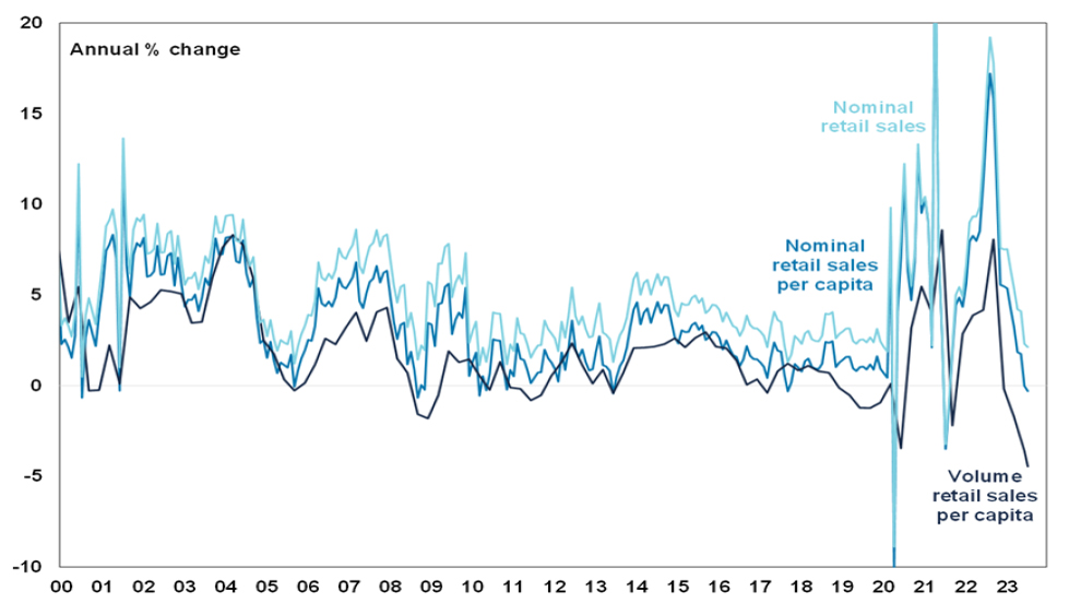 • Real retail sales have fallen for three quarters in a row and are very weak on a per capita basis, ie adjusting for population growth.