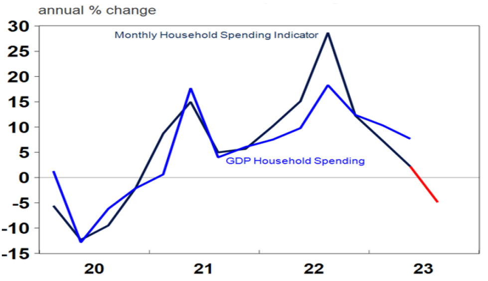 • The ABS’ Household Spending Indicator suggests annual growth in nominal consumer spending has gone negative this quarter which suggests weakness in both goods and services.