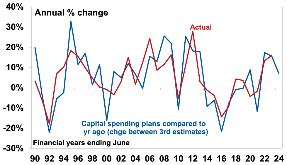 • Business investment plans as surveyed by the ABS for the current financial year are only up 7.1% on the same estimate made for the last financial year pointing to a deceleration in growth from the 15.9% rise seen in 2022-23. This is in nominal terms so the slowdown after allowing for inflation will be greater.