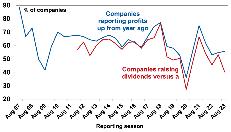 • The June half profit reporting season saw less companies than normal report profits up on a year ago and far less than normal raise their dividends, suggesting a degree of caution.