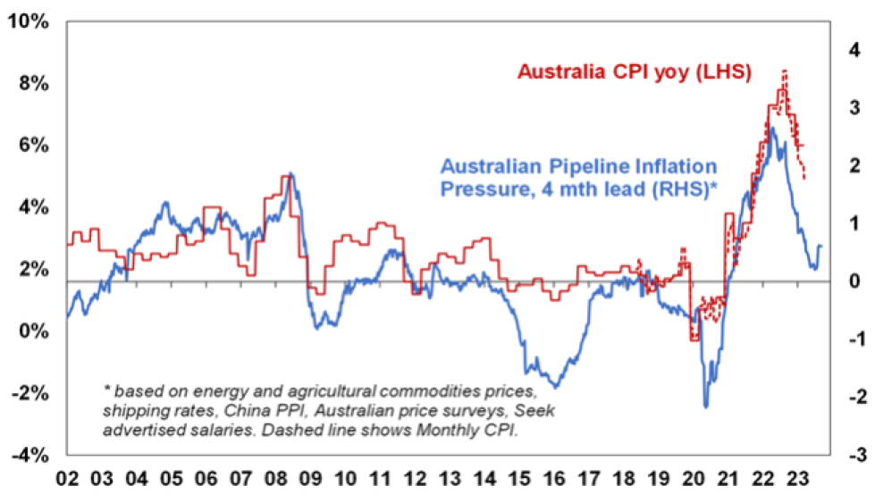 Finally, while our Australian Inflation Indicator has picked up a bit with higher labour and raw material costs it continues to point to a further rapid fall in inflation.