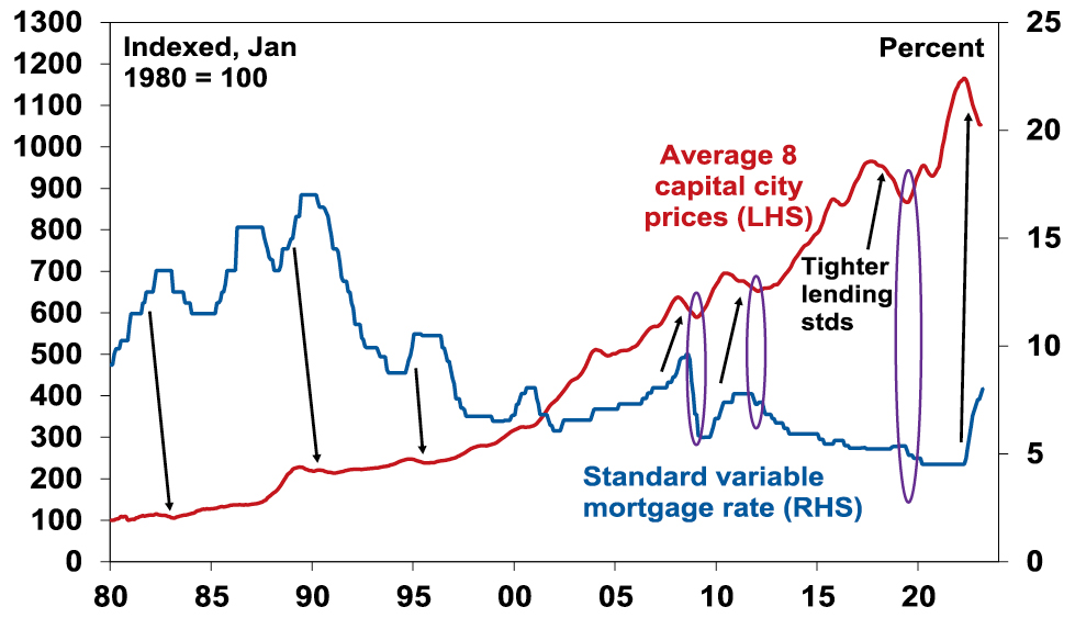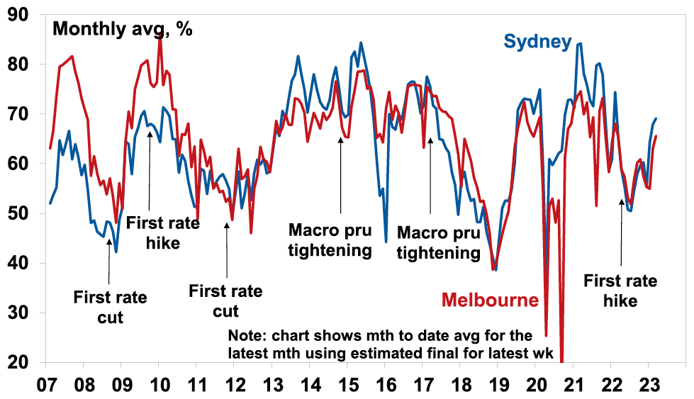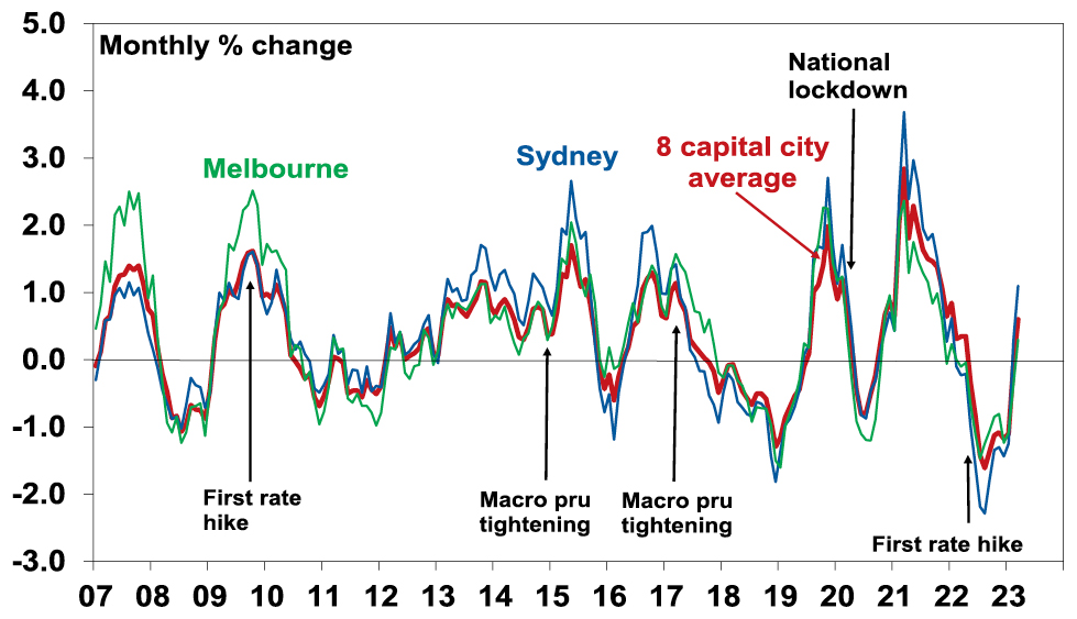 From their high in April to their low last month national average home prices have fallen 9.1% making it their biggest fall in CoreLogic records going back to 1980. Capital city average prices were down 9.7% which is their second biggest fall, after the 10.2% fall in 2017-19. However, average price falls had slowed to a crawl and CoreLogic data shows that this has morphed into price gains across several cities so far in March with Sydney prices tracking up 1.1% at a monthly rate and five capital city average prices tracking up 0.6%. See the next chart. If home prices have bottomed this would leave them short of our expectation for a 15-20% top to bottom fall. So are property prices doing it again? – falling less than expected and then rising more than expected. This note looks at the positives and negatives for the residential property market outlook.
