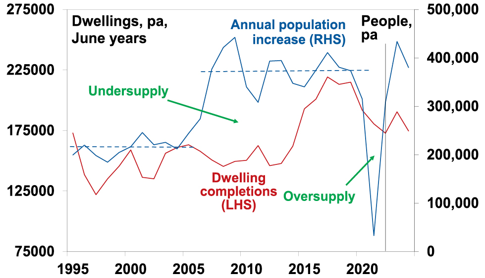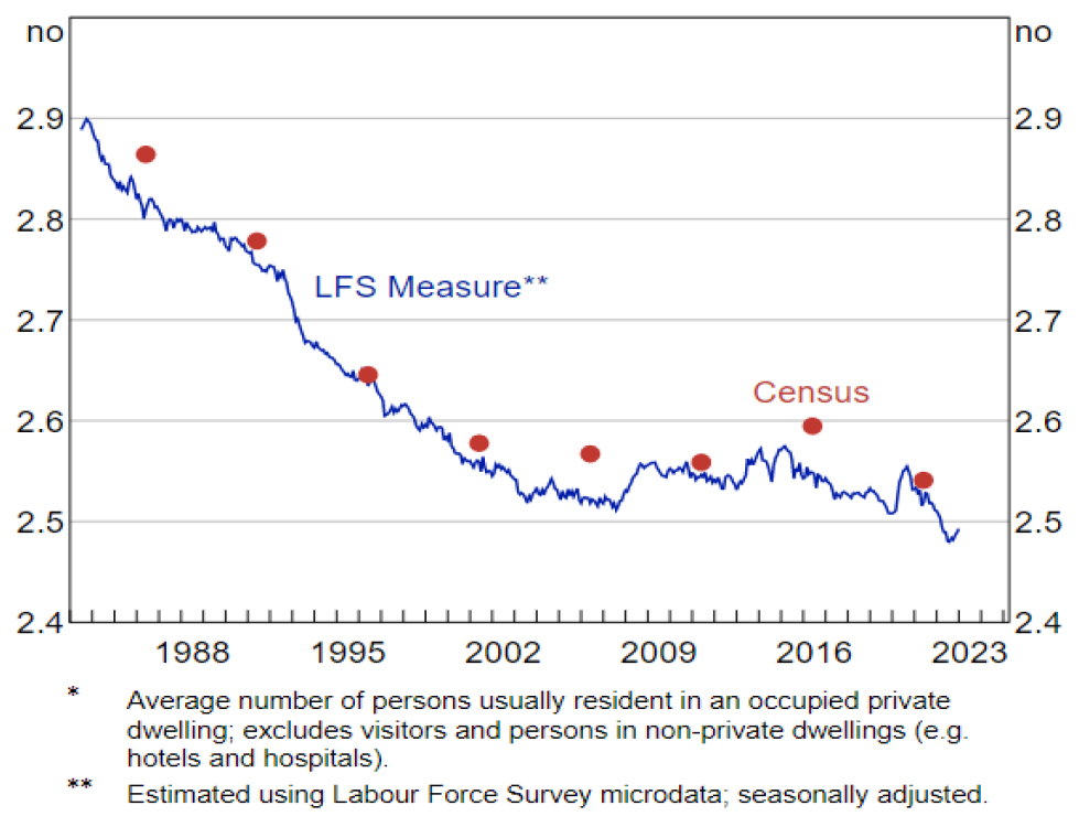 RBA analysis shows a decline in household average household size since the start of 2020 of around 1%, which it estimates has added around 120,000 households to underlying dwelling demand partly offsetting the negative impact on demand from the hit to immigration through the pandemic lockdown.