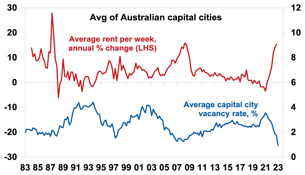 Partly reflecting this, capital city rental vacancy rates below 1% are driving a surge in rents. This should be positive for investor demand.