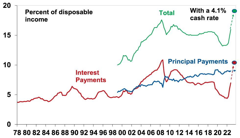 Household debt servicing payments as a share of income have already risen to their highest in more than a decade resulting in a large squeeze on household cashflows but will rise further given the lagged flow through of variable rates and the fixed rate reset. A rise in the cash rate to 4.1% would see them pushed to record levels. This will remove roughly 5% of household cashflow in relation to income.