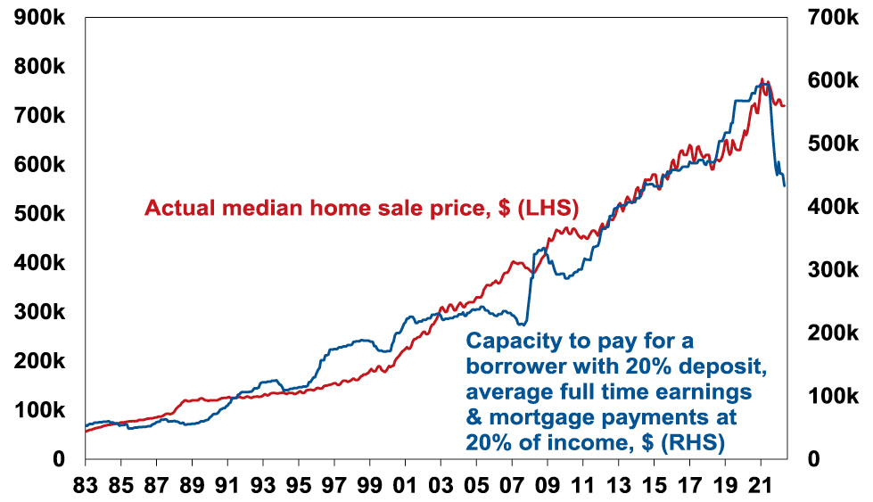 The hit to home buying capacity from rate hikes – of around 27% for a buyer with a 20% deposit and average full-time earnings – remains even if rates have stopped rising. See the next chart.