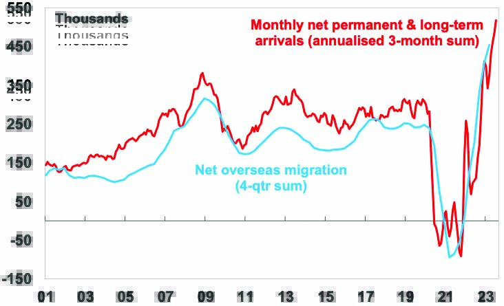 March quarter data showed that Australia’s population rose by 563,000 or 2.2% over 12 months, with 454,000 of that coming from immigration. Permanent and long-term arrival data up to July suggest that the surge in immigration is continuing and we are on track for net immigration of 500,000 or more in the last financial year.