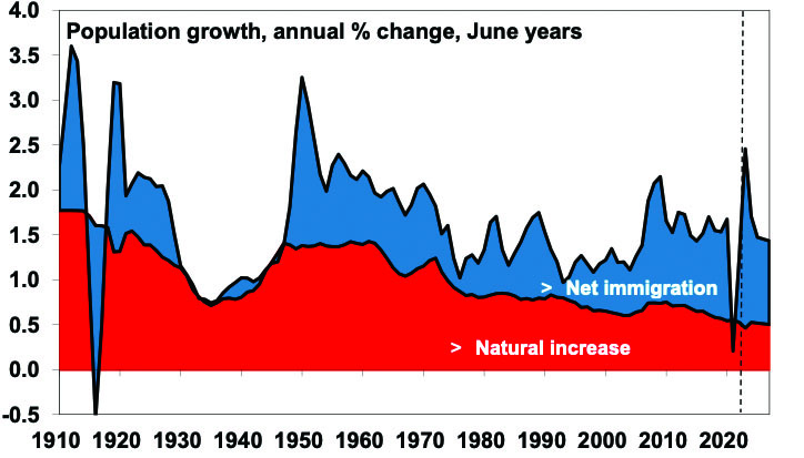 This would take population growth to 2.5% in 2022-23, its fastest since the 1950s. Note the next chart assumes net immigration falls to 315,000 this financial year and 260,000 thereafter as consistent with the May Budget projections, but budget immigration projections have been very unreliable. For example, net immigration for 2023-24 was projected to be 213,000 in the March 2022 Budget, 235,000 in the October 2022 Budget and 400,000 in the May Budget but now looks like 500,000 or more.