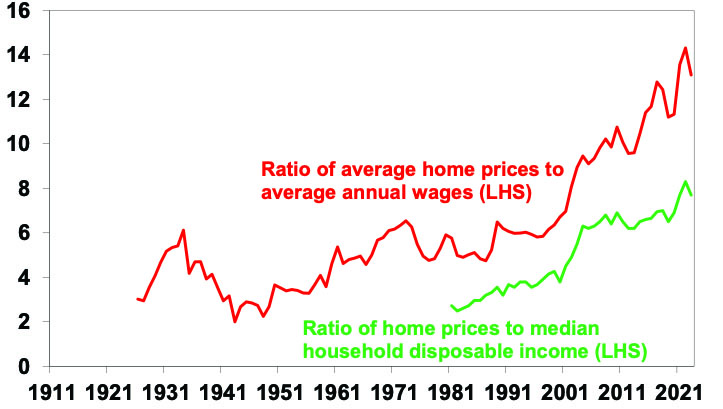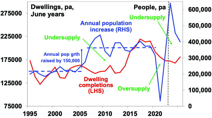 Starting in the mid-2000s annual population growth jumped by around 150,000 people on the back of a surge in net immigration levels – see the blue line in the next chart. This should have been matched by an increase in dwelling completions of around 60,000 per annum but there was no such rise in completions until after 2015 leading to a chronic undersupply of homes – see the red line. The unit building boom of the second half of last decade and the slump in population growth through the pandemic helped relieve the imbalance but the unit building boom was brief and a decline in household size from 2021 resulted in demand for an extra 120,000 dwellings on the RBA’s estimates. The rebound in population growth has taken the property market back into undersupply again.