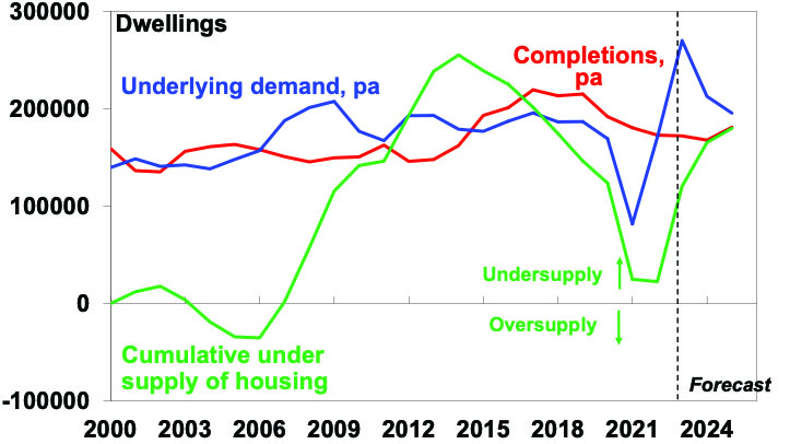 The next chart looks at this in terms of underling demand (blue line) and supply (red line) for homes and the cumulative undersupply gap between them (green line). Up until 2005 the housing market was in rough balance. It then went into a massive shortfall of about 250,000 dwellings by 2014 as underlying demand surged with booming immigration. This short fall was then cut into by the unit building boom and we nearly got back to balance in the pandemic. A rebound in underlying demand on the back of this year’s immigration surge and weak completions has now pushed the shortfall back up to 120,000 and by mid next year it will be around 165,000. This makes no allowance for the pandemic induced fall in household size which could take the shortfall up to around 285,000.