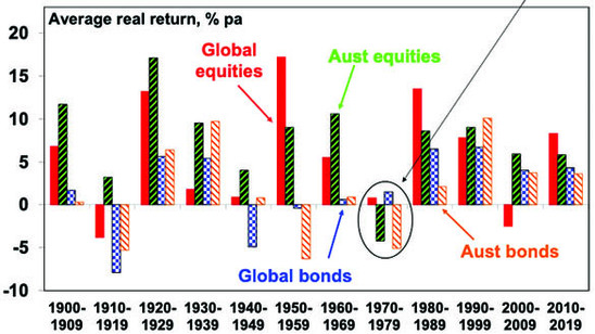 So the bottom line is that a sustained period of high and rising inflation can be a problem for bonds, shares and other growth assets. As can be seen in the next chart, the high inflation 1970s was one of the few decades to see poor real (ie after inflation) returns from bonds and shares.