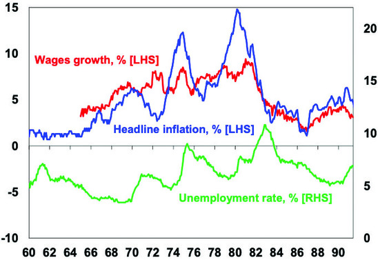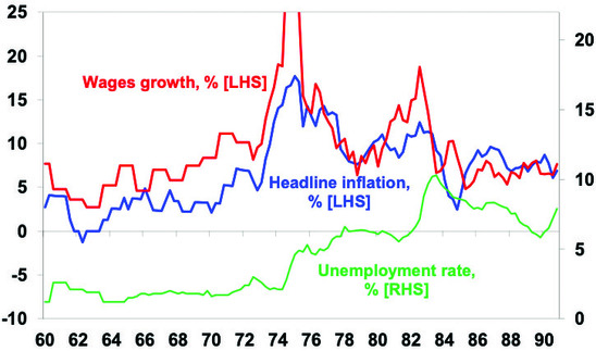 Australian inflation, wages grth & unemployment, 1960-90