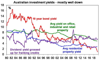Investment returns have two components: yield (or income flow) and capital growth. Looking at both of these components points to lower average investment returns over the next five years compared to the last five years. It’s basic to investing that the price of an asset moves inversely to its yield all other things being equal. Suppose an asset pays $10 a year in income and suppose its price is $100, which means an income flow or yield of 10%. If interest rates are cut resulting in increased demand for the asset, as investors search for a higher yield, such that its price rises to $120 given the $10 annual income flow its yield will have fallen to 8.3% (ie $10 divided by $120) as its price has gone up by 20%. So, yield moves inversely to price. But as yields decline it means a lower return potential going forward.