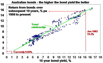 For bonds, the best predictor of future medium-term returns is current bond yields as can be seen historically in the next chart. If a 10-year bond yield is held to maturity its initial yield (0.93% right now in Australia) will be its return over 10 years (ie 0.93%). We use 5-year bond yields as they more closely match the maturity of bond indexes.