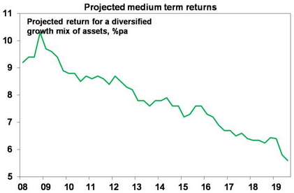 Today the cash rate is 1%, 1-year bank term deposit rates are 1.5%, 10-year bond yields are 0.9%, gross residential property yields are around 3%, commercial property yields are just below 5%, dividend yields are still around 5.5% for Australian shares (with franking credits) but they are 2.5% for global shares. This points to a lower return potential for a diversified mix of assets.