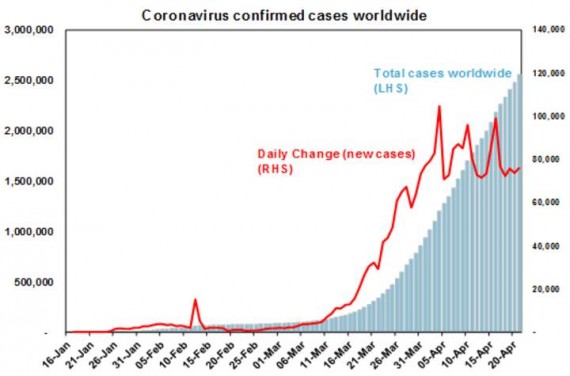 • The reported number of coronavirus cases globally is still rising and has now gone through 2.5 million.