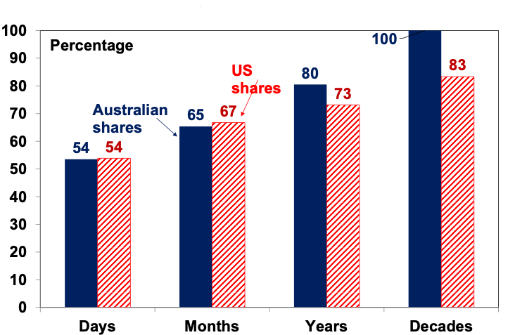 Checking up on how your investments are doing is a good thing, surely? But the danger is that the more investors are exposed to news around their investments, the more they may see them falling. Whereas share markets have historically generated positive returns more than 60% of the time on a monthly basis and more than 70% of the time on a calendar year basis, day-to-day it’s close to 50/50 as to whether the share market will be up or down.