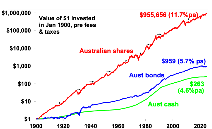 Cash and bank deposits are low risk and fine for near term spending requirements and emergency funds, but they won’t build wealth over time. The chart below shows the value of $1 invested in various Australian assets since 1900 allowing for the reinvestment of interest and dividends along the way. That $1 would have grown to $955,656 if invested in shares but only to $263 if invested in cash. Despite periodic setbacks, shown with arrows (such as WWI, the Great Depression, WWII, stagflation in the 1970s, the 1987 share crash & the GFC), shares and other growth assets grow to much higher values over time thanks to their higher returns over the long term than cash and bonds and thanks to the magic of compound interest where higher returns build on higher returns through time.