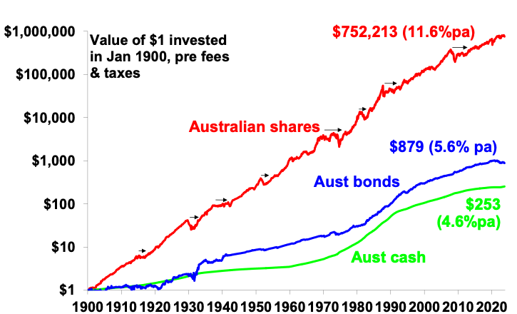 The volatility set off by the pandemic and now flowing from high inflation and interest rate increases does nothing to change this, any more than previous setbacks (highlighted with arrows) like WW1, the Great Depression, the 1973-74 bear market, the 1987 crash or the GFC did. The likely end of the secular decline in inflation and interest rates over the last few decades which super charged investment returns means average returns over the next decade or so will be somewhat more constrained than we have become used to. But shares offering a dividend yield of 4% (5% or more with franking credits) should still provide superior medium-term returns and hence grow wealth better than bonds where the 10-year yield is 4.50% pa. Unfortunately making the most of the magic of compounding returns can be one of the hardest things to do.