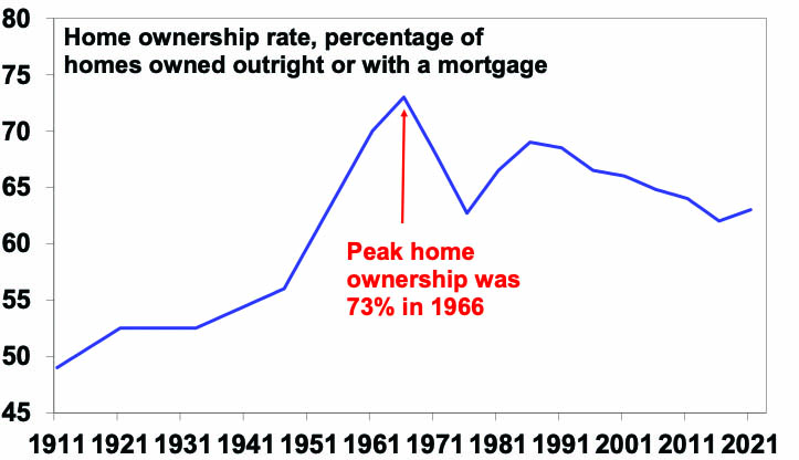 In my view, the most interesting chart in the report is that of home ownership based on ABS Census data dating back to 1911 that Bernard Salt and his team discovered peaked around 1966. Just before World War One, Australia’s home ownership rate was just below 50%, but from even this relatively high rate it surged in the post-World War Two years to reach a peak of 73% in 1966 as home ownership was seen as delivering financial security after the malaise of the Great Depression and World War Two. As the report notes, at the time it was all about “getting married, having kids, buying a house and holding a steady job”. Retirement planning was rarely on the radar with life expectancy at around 70 in the late 1950s and early 1960s. In the aftermath of the Depression and World War Two, the concept of wealth was seen as tied up to owning a home. However, from the peak in 1966, housing affordability has trended down to now being around 63%. The question is whether this decline reflects deteriorating housing affordability flowing from years of property booms, leading to a fading in the “Aussie dream” which is centred on home ownership or whether it’s something deeper.