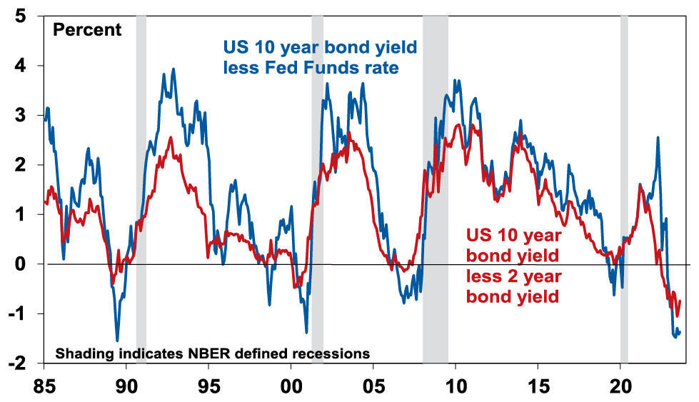 • The lag from yield curve inversion in the US can be 18 months. Various versions of it first inverted between July last year and January this year. So given normal lags it may not eventuate until next year.