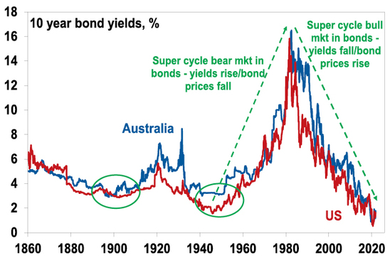 For the past four decades a key feature of investment markets has been a super cycle bull market in bonds that saw 10-year bond yields fall from around 16% to lows last year around zero (and well below in some countries). This multi decade decline helped propel a global “search for yield” by investors that has pushed down yields and pushed up prices of most other assets. Underpinning it has been a collapse in inflation globally. While there have been numerous premature calls over the years that the super cycle bull market in bonds is over (including some from me) its looking increasingly likely that this time for a bunch of economic and political reasons it may actually be over. This note looks at why and what it may mean for investors.