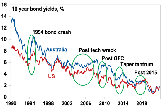 Then from the early 1980s it abruptly changed as a near 40-year super cycle decline in bond yields set in. This was driven by aggressive inflation fighting central banks in the early 1980s and 90s, supply side reforms, globalisation, lower costs and increased competition flowing from digitalisation, rising inequality depressing spending, spare capacity and reduced worker bargaining power with worries about deflation in recent times combined with safe haven investor demand for bonds, rising demand for safe income yielding assets as populations age, excess global savings & central bank bond buying since the GFC. This saw 10-year bond yields plunge to around 0.5% last year in the US and Australia (and even lower in other countries).