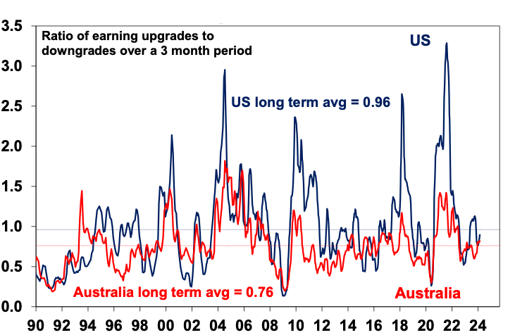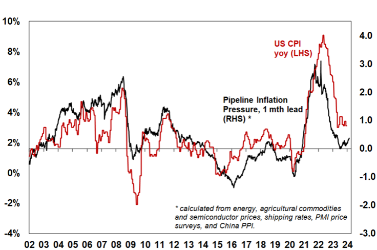 Our US Pipeline Inflation Indicator has picked up slightly this year partly reflecting higher global shipping costs but these appear to be stabilising and the Indicator appears to reflect normal volatility around the 2% Fed target level and so it’s still consistent with lower US inflation. Services inflation remains sticky but is likely to slow reflecting cooling wages growth and rising productivity growth. We expect the Fed to start cutting rates in June.