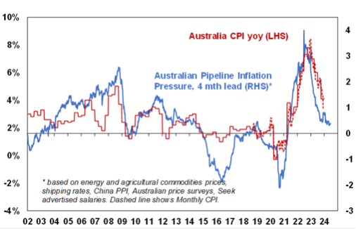 Australian inflation is lagging the US by 6 months, but our Australian Pipeline Inflation Indicator is continuing to trend down pointing to a further fall in inflation. While the RBA retains a mild tightening bias awaiting “sufficient confidence that inflation [will] return to target in a reasonable time frame” our assessment is that the cash rate has peaked and that the RBA will start cutting from around mid-year.