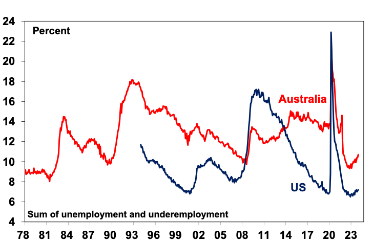 Labour market tightness remains critical as it determines wages growth which is the biggest component in most business costs. Tight labour market conditions post the pandemic have seen wages growth pick up and this is now the main driver of sticky service sector inflation. The risk is that high wages growth locks in high inflation making it harder to get inflation back down without a deep recession. However, while labour markets remain tight – evident in still low unemployment – they appear to be cooling with falling job openings and hiring plans and a gradual rising trend in unemployment and underemployment now evident in both the US and Australia. As a result, wages growth looks to have passed the peak in the US, Europe and UK and is likely at the peak in Australia. However, central banks including the RBA would like to see more evidence that this is the case and so labour market underutilisation will be watched closely.