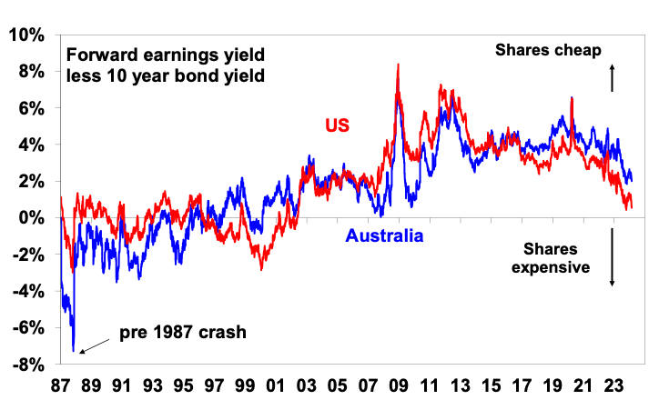 Since 2020, rising bond yields weighed on share market valuations. As a result, the gap between earnings yields and bond yields (which is a proxy for shares’ risk premium) has narrowed to narrowed to its lowest since the GFC in the US and Australia. Compared to the pre-GFC period shares still look cheap relative to bonds, but this is not the case compared to the post GFC period suggesting valuations may be a bit of a constraint to share market gains given uncertainties around interest rates, economic and earnings growth and various geopolitical issues. Australian share valuations look a bit more attractive than those in the US though helped by a higher earnings yield (or lower PEs). Ideally bond yields need to decline.