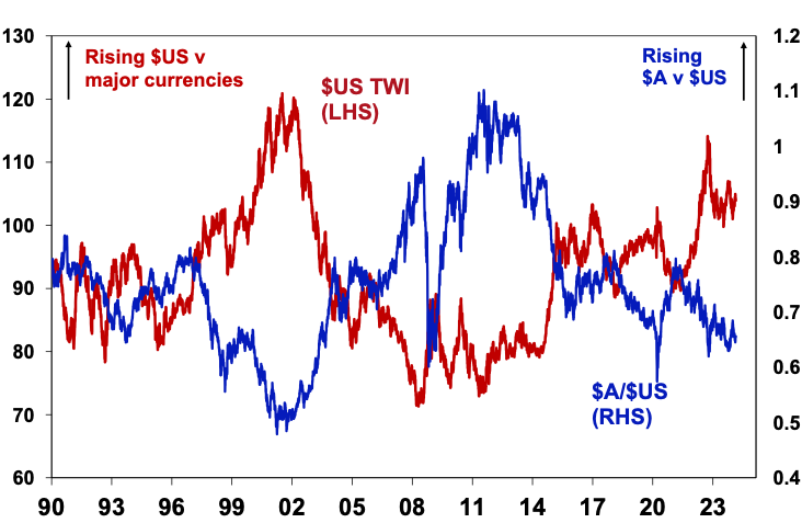 Due to the relatively low exposure of the US economy to cyclical sectors (like manufacturing) and the high use of US dollar denominated debt, the $US is a “risk-off” currency. It tends to go up when there are worries about global growth and down when the outlook brightens. An increasing $US is also bad news for those with $US denominated debt in the emerging world. So, moves in it bear close watching as a key bellwether of the investment cycle. 2022 saw a surge in the $US with safe haven demand in the face of worries about recession, war and aggressive Fed tightening. Since its high it has fallen back which is a positive sign – but the decline has stalled over the last year suggesting a degree of caution. A further downtrend in the $US would be a positive sign for investment markets this year, whereas a sustained new upswing would suggest they may be vulnerable. So far though it looks stuck, which also partly explains the softness in the $A which is a cyclical currency.