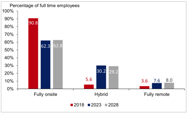 While there has been a return to the office, for many its only two or three days a week. Basically, the lockdowns resulted in a step jump towards working from home (WFH). A UK study of over 2000 firms is indicative. It showed that while around 90.8% of employees were fully onsite in 2018, last year this had fallen to 62.3%, with 30.2% with hybrid (working in the office and at home) arrangements. Similarly, the ABS found 37% of employed people in Australia regularly worked from home. Of course, this masks a huge range with industries with a high proportion of computer-based workers having more hours working at home. And firms expect this to remain the case. There are huge benefits to physically working together around culture, collaboration, idea generation and learning but there are also benefits to working from home with no commute time, greater focus, less damage to the environment, better life balance and for companies – lower costs, more diverse workforces and happier staff. So the ideal is probably a hybrid model. The proportion of workers in a hybrid model may even rise as new firms are quicker to embrace WFH.