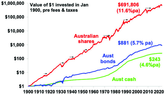 Bouts of volatility are the price we pay for the higher longer-term returns from shares compared to other assets like cash and bonds. The next chart shows the value of $1 invested in various Australian assets in 1900 allowing for the reinvestment of dividends and interest along the way. That $1 would have grown to $243 if invested in cash, to $881 if invested in bonds and to $691,806 if invested in shares. While the average return since 1900 is only double that in shares relative to bonds, the huge difference between the two at the end owes to the impact of compounding returns on top of returns. So, if we want to grow our wealth we need an exposure to growth assets like shares to make the most of the power of compound interest, but with that comes rough patches every so often.