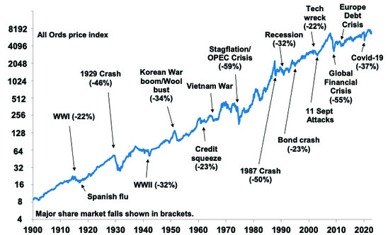 First, while they all have different triggers and unfold differently, periodic share market falls are healthy and normal. Sometimes they are just 5% to 20% corrections, but every so often they can be deep bear markets with falls up to around 50% as in the GFC. But while share market pullbacks can be painful, it’s the way the share market has always been, so they are nothing new. As can be seen in the next chart shares climb a wall of worry over many years but with numerous events dragging them down periodically, but with the long-term rising trend ultimately resuming.