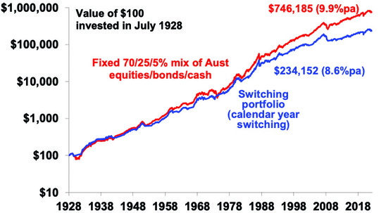 Over the long run the switching portfolio produces an average return of 8.6% pa versus 9.9%pa for the balanced mix. From a $100 investment in 1928 the switching portfolio would have grown to $234,152 by September but the constant mix would have increased to $746,185.