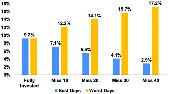 Of course, you may be thinking “but I will reinvest once uncertainty is removed”. But the risk is you don’t feel confident to get back in until long after the market has fully recovered, which may be well above the level you sold out at. Trying to time the market is very difficult. A good way to demonstrate this is with a comparison of returns if an investor is fully invested in shares versus missing out on the best (or worst) days. The next chart shows that if you were fully invested in Australian shares from January 1995, you would have returned 9.2%pa (including dividends but not allowing for franking credits, tax and fees).