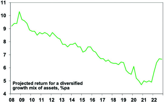 When shares and all assets fall in price, they’re cheaper and offer higher long-term return prospects. As a result of the fall in share and bond prices (and the resultant decline in PEs and rise in dividends yields and bond yields) our estimated medium term return projections for a diversified growth mix of assets has improved from around 4.9%pa to around 6.7%pa. So, the key is to look for opportunities’ pullbacks provide. It’s impossible to time the bottom but one way to do it is to “average in” over time.