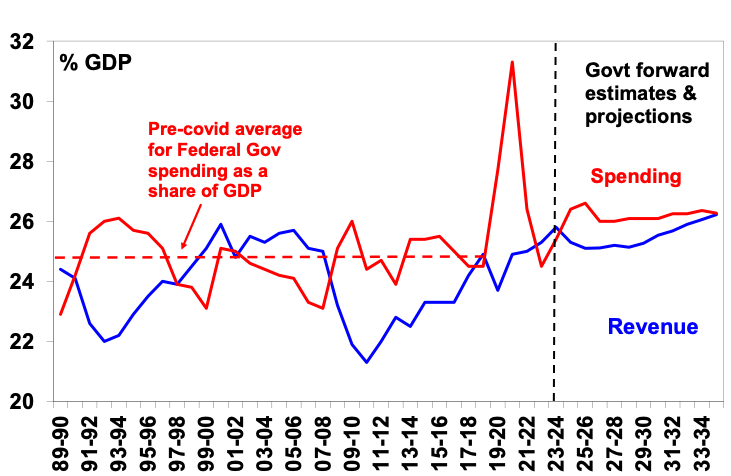 This Budget like all of those since 2020 has again benefitted from extra revenue flows coming from higher personal tax collections due to stronger jobs growth and higher commodity prices (and hence mining profits) than assumed. This is not smart management but good luck flowing from conservative forecasts. This windfall (see the line called “parameter changes” in the next table) is estimated to reduce the deficit this financial year by $10.6bn compared to last December’s update, with a total benefit over the five years shown of $12.6bn. But this table – a more detailed version of which appears in the Budget papers and is nicknamed the “table of truth” – also shows how much of the windfall has been spent (see the line called “new stimulus”). Last year only 14% of the windfall through the forward years was spent but this budget nearly twice the windfall (i.e. $24.4bn) is being spent. As a result, while the budget now looks better for this financial year (with another surplus – which could turn out to be even bigger), because of the extra spending in subsequent years it now looks worse from 2024-25.