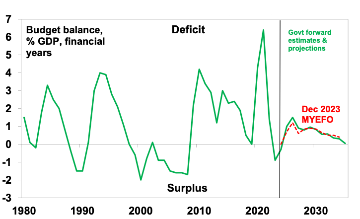 The Government left its growth forecasts unchanged for this year but revised them down slightly for the next two years. Notably it has revised down slightly its inflation forecasts and still sees wages growth slowing from here as does the RBA, but an obvious risk to this is that its support for wage increases in certain industries has a flow on effect to other industries (just as the aged care wage rises last year seems to be leading to higher wages for childcare workers). It also sees lower inflation this year and next than the RBA and this is partly due to a continuation of cost-of-living relief measures that it sees as lowering measured inflation (by 0.5% in 2024-25), whereas the RBA assumed the measures lapse.
