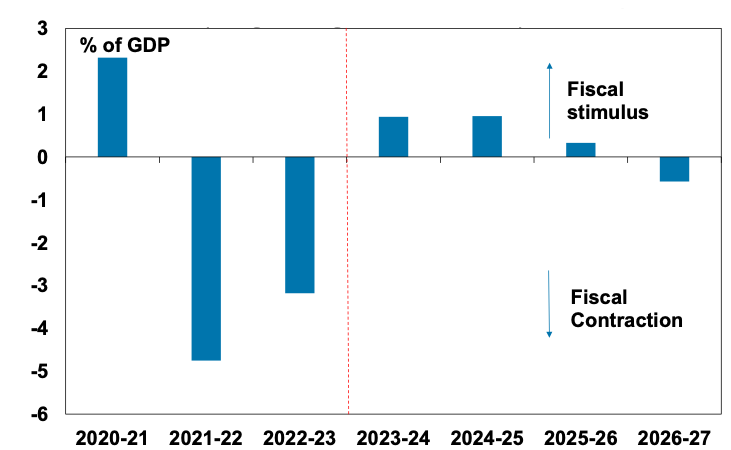 Inflation. The cost-of-living measures will help lower measured inflation. But the new stimulus (shown in the “table of truth” above) risks boosting demand. Federal and state fiscal positions point to a sharp shift from fiscal contraction (which helps lower demand and inflation) to expansion over the year ahead (see the next chart). And Government support for high wage increases for some sectors risks adding to wages growth given the flow on and influencing effects at a time when wages growth is already at its maximum level consistent with the inflation target. All of which risks making the RBA’s job harder.