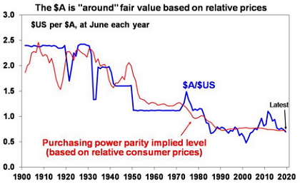 The first thing to note is that from a very long-term perspective the Australian dollar is around or just below fair value. This contrasts to the situation back in 2011 when it was well above long-term fair value. The best guide to this is what is called purchasing power parity (PPP) according to which exchange rates should equilibrate the price of a basket of goods and services across countries – see the next chart.