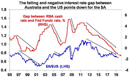 This will keep inflation lower in Australia than in the US and so we see the RBA cutting rates more than the Fed. And the RBA is much closer to having to do quantitative easing or some variant of it (ie using printed money to boost growth) than the Fed. This will continue to make it relatively less attractive to park money in Australia. As can be seen in the next chart, periods of a low and falling interest rate differential between Australia and the US usually see a low and falling $A.