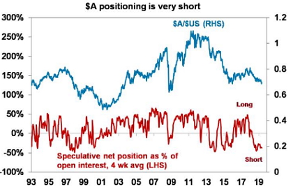 Against this there are a bunch of forces acting to support the $A, and this has been evident in its relative resilience despite bad news in recent weeks. Firstly, global sentiment towards the Australian dollar has been negative for some time and this has been reflected in short or underweight positions in the $A being at extreme levels – see the next chart. In other words, many of those who want to sell the $A have already done so and this leaves it vulnerable to a rally if there is any good news.